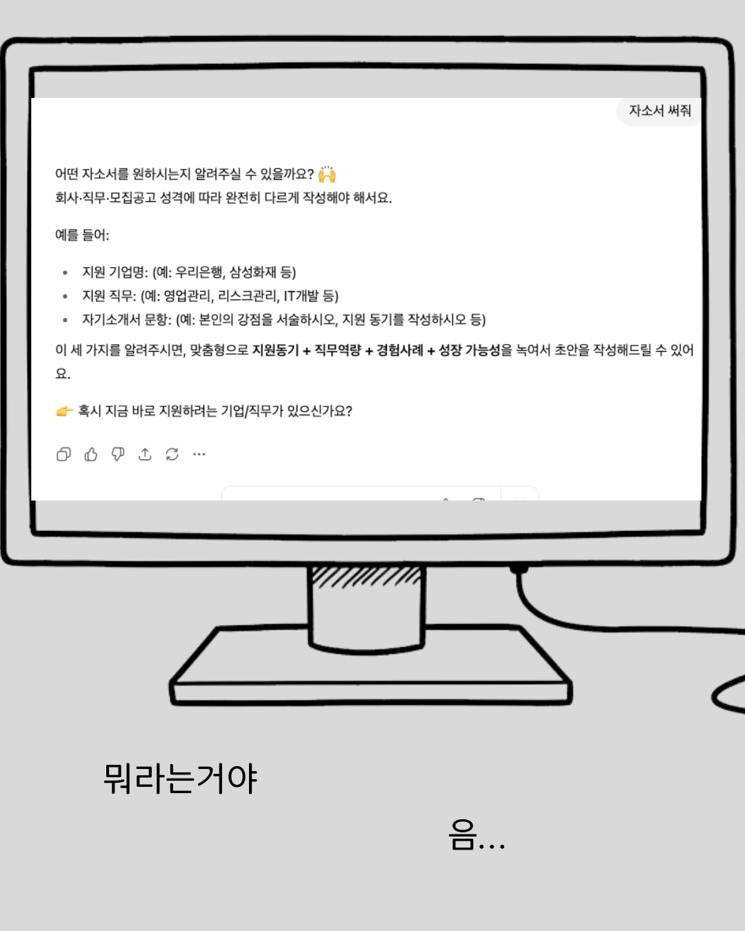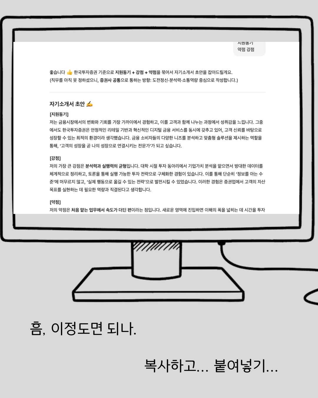 AI에게 "금융권 자기소개서 써줘"라고 던지고는 나오는 뻔한 결과물에 실망하거나, 아니면 AI는 믿을 수 없다며 혼자서 끙끙 앓다가 결국 어설픈 결과물을 내놓거나.
