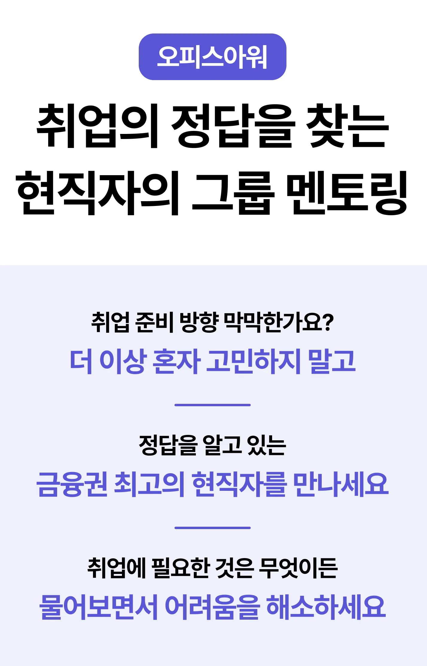 단순히 이론을 전달하는 자리가 아닙니다. 취업의 정답을 찾는 현직자의 그룹 멘토링, 여러분의 문서가 완성되는 그 순간까지 함께하는 특별한 시간입니다.