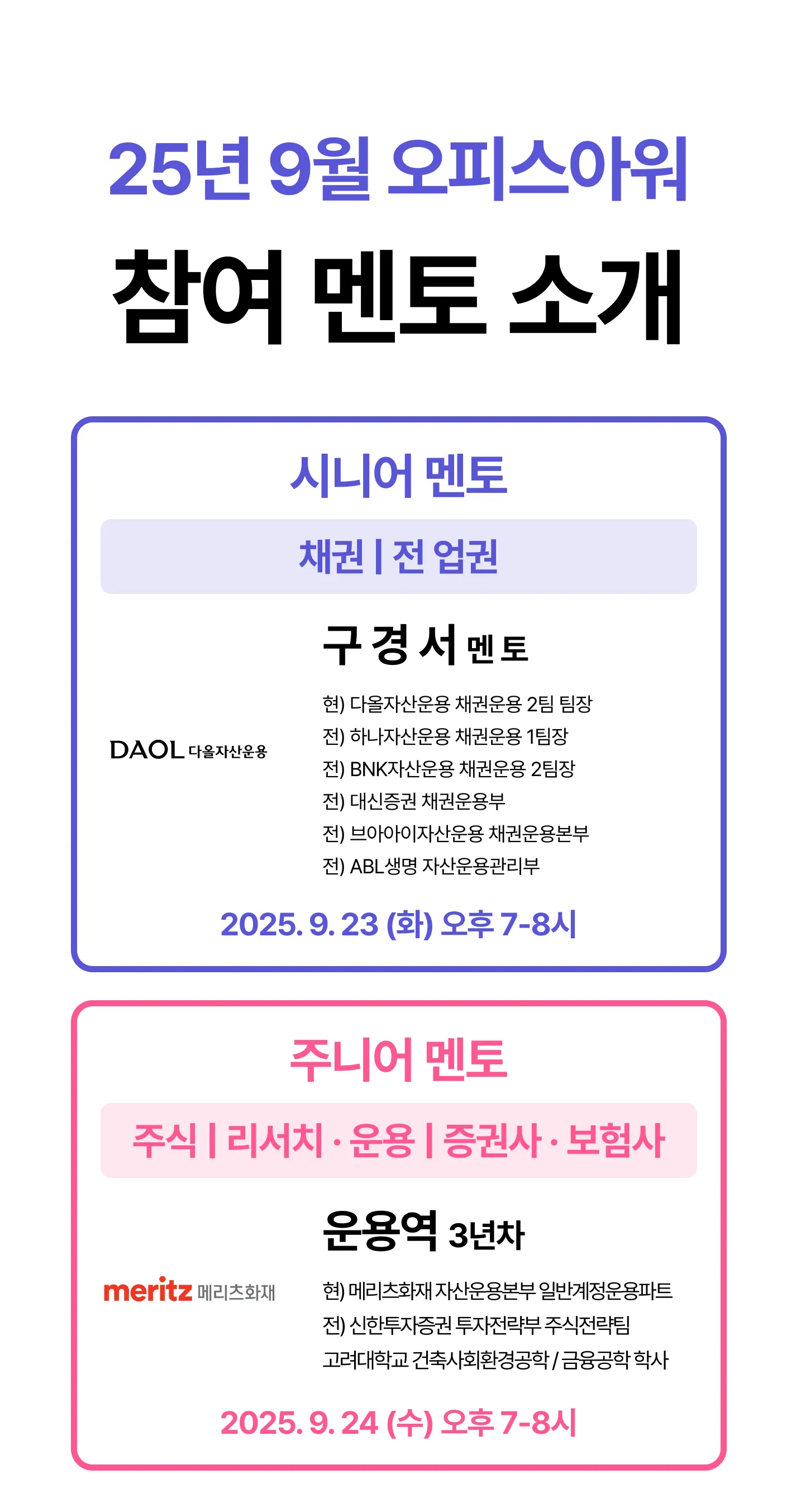 운용역 멘토님 - 현 메리츠화재 자산운용본부에서 일하시며 여러 분야의 다양한 경험을 공유해주십니다 !