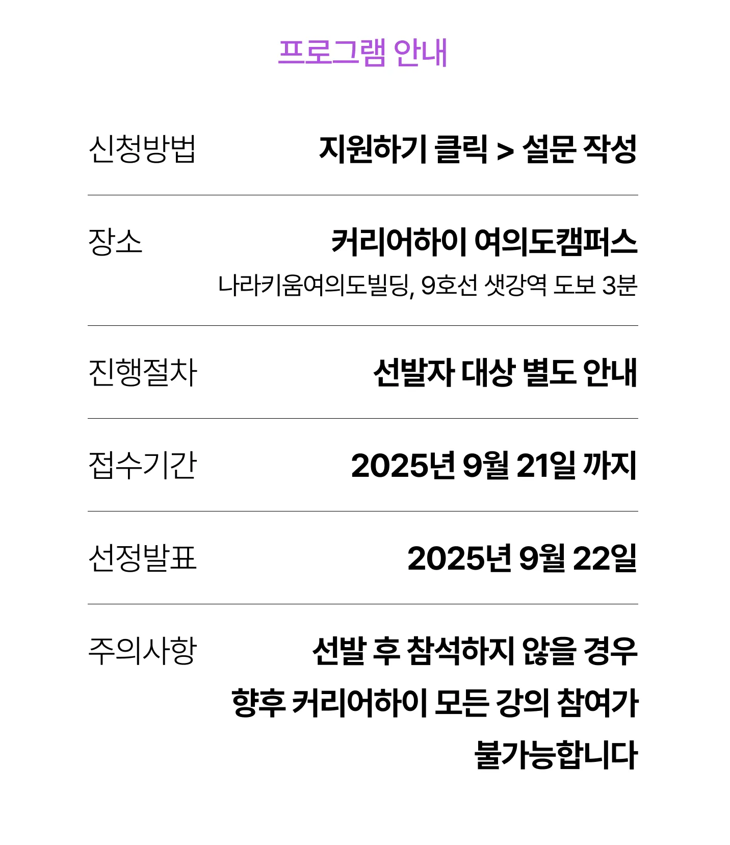 주의사항: 선발 후 참석하지 않을 경우, 향후 커리어하이의 모든 강의 참여가 불가능합니다.