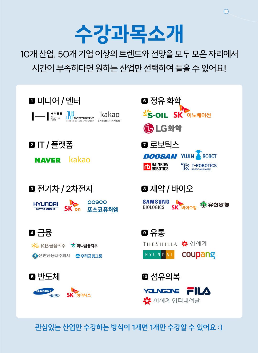 11월 13일부터 26일까지 2주간 진행되는 이번 프로그램은 10개 산업, 10개 대표기업의 애널리스트들이 참여하여 현직자의 취업시장을 한눈에 보여드립니다.