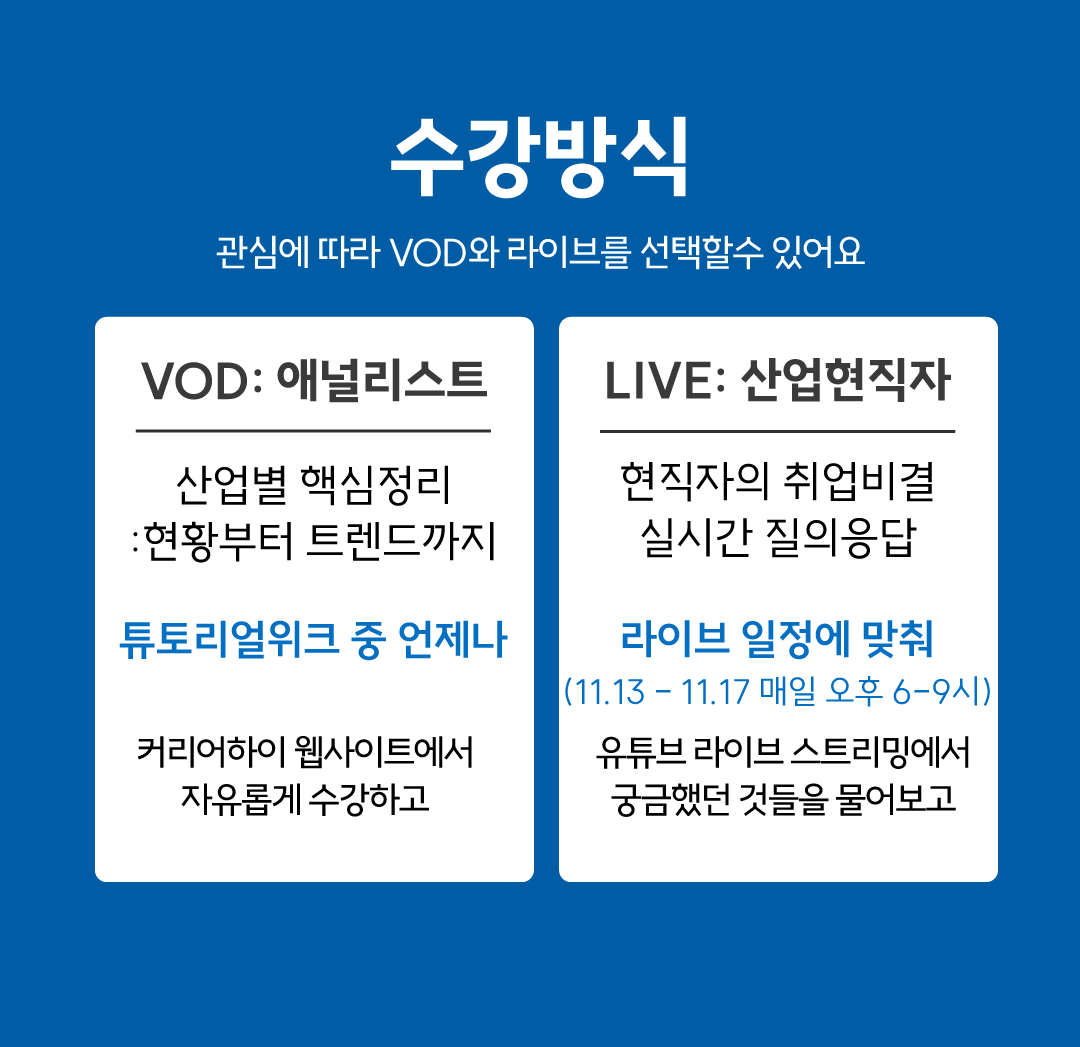 LIVE 강의: 산업현직자 현직자의 취업시장 시각과 일정을 실시간으로 공유하며, 궁금한 점을 직접 질문할 수 있는 소중한 기회입니다.