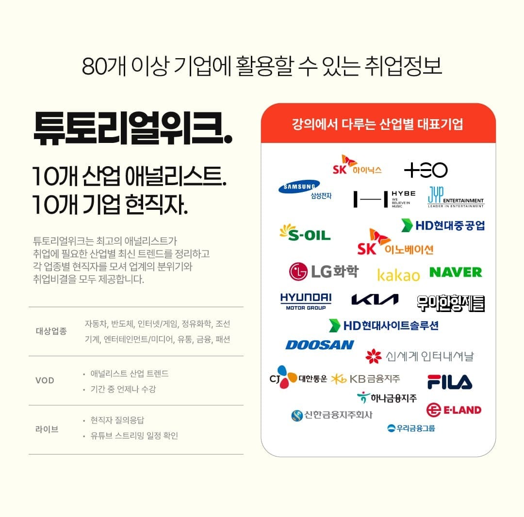 10개 기업 현직자들의 생생한 증언 실제로 일하고 있는 현직자들이 직접 나서서 "진짜 우리 회사는 이래요"라는 솔직한 이야기를 들려줄 예정입니다.