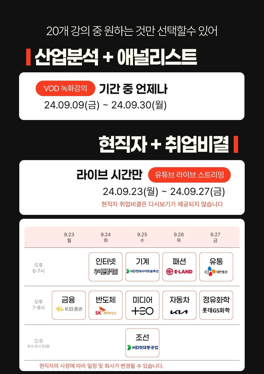 9월 23일-27일, 매일 오후 7-9시, 현직자 라이브 10개 기업 현직자들과 실시간으로 만나는 특별한 시간입니다. 궁금한 점을 직접 질문하고, 생생한 현장 이야기를 들을 수 있습니다.