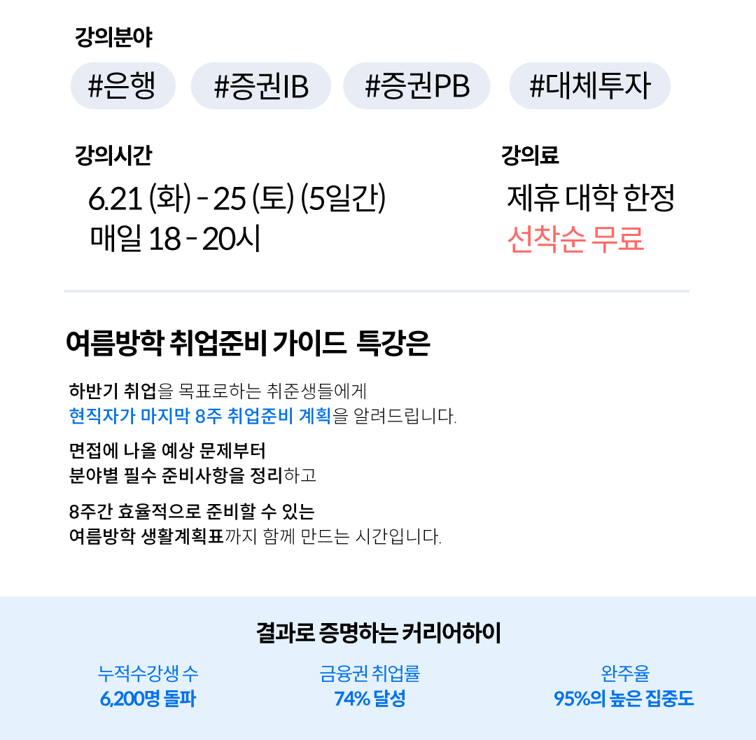 하반기 채용의 마지막 8주, 여름방학이 현직자가 제안하는 금융권 취준가이드로 효율적으로 준비할 수 있는 여름방학 생활계획표까지 함께 만나는 시간입니다.