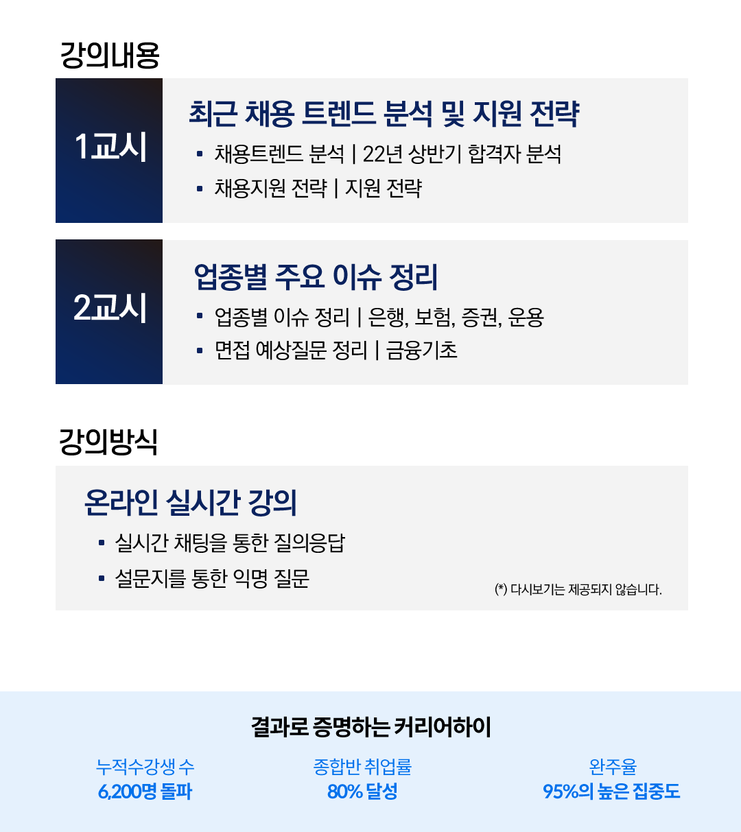 3시간 동안 압축적으로 전달되는 금융권 취업의 핵심 전략. 취업률 80%를 달성한 검증된 노하우. 이 모든 것이 여러분의 성공적인 하반기 채용을 위한 마지막 선물입니다.