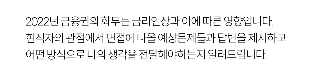 단순한 면접 이론이 아닙니다. 2022년 금융권의 화두인 금리인상과 이에 따른 영향을 현직자의 관점에서 면접에 나올 예상문제들과 답변을 제시하고 어떤 방식으로 나의 생각을 전달해야 하는지 알려드립니다.