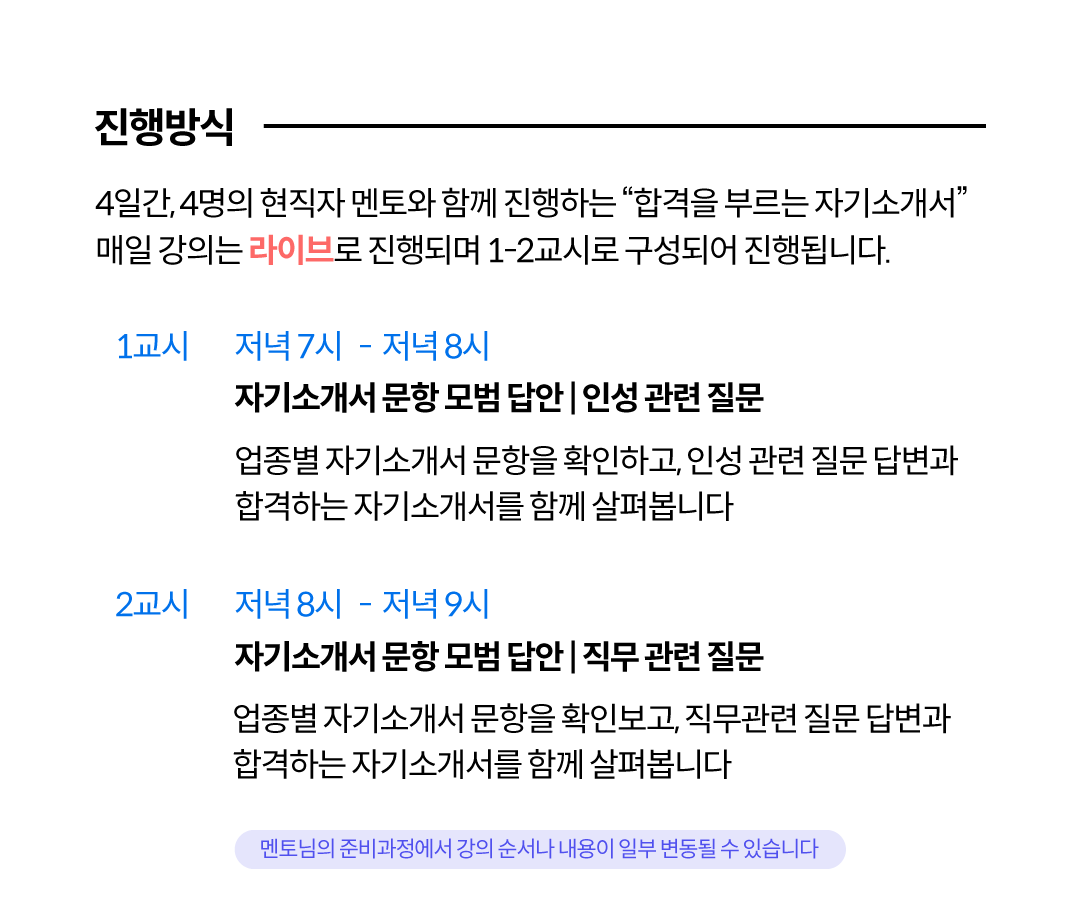 1교시: 자기소개서 문항 모범 답안, 인성 관련 질문 업종별 자기소개서 문항을 확인하고 인성 관련 질문 답변과 합격하는 자기소개서를 함께 살펴봅니다.