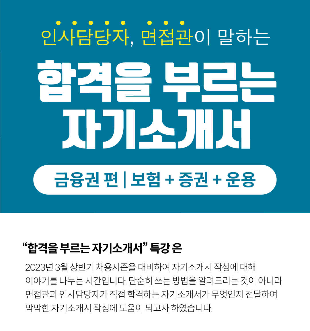 "어떻게 써야 눈에 띄는 자소서가 될까요?" "인사담당자와 면접관이 정말 원하는 게 뭔가요?" "합격을 부르는 자기소개서의 비밀이 있을까요?"