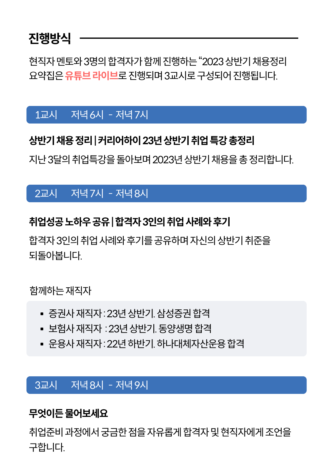 2교시: 취업성공 노하우 공유, 합격자 3인의 취업 사례와 후기 합격자 3인의 취업 사례와 후기를 공유하며 자신의 상반기 취준을 되돌아봅니다.