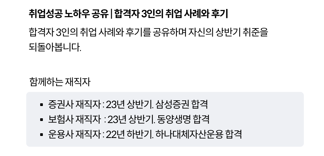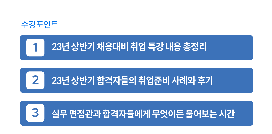 수강포인트 2: 23년 상반기 합격자들의 취업준비 사례와 후기 실제 합격자들이 직접 나서서 자신들의 준비 과정과 성공 요인을 생생하게 공유합니다.
