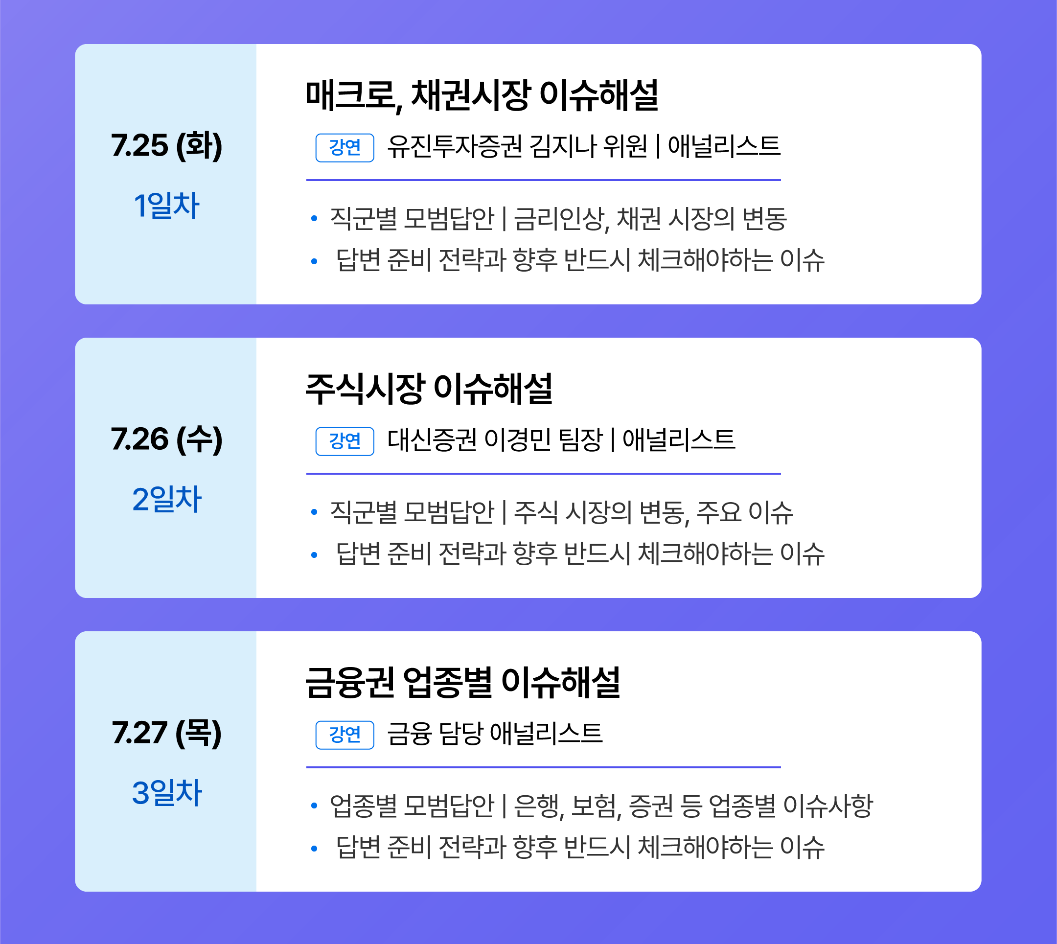 7월 25일(화) - 1일차: 매크로, 채권시장 이슈해설 유진투자증권 김지나 위원이 애널리스트 관점에서 거시경제와 채권 시장의 변동 요인을 분석합니다. 직군별 모범답안과 금리인상, 채권 시장의 변동에 답변 준비 전략과 광후 반드시 체크해야하는 이슈까지 체계적으로 정리합니다.