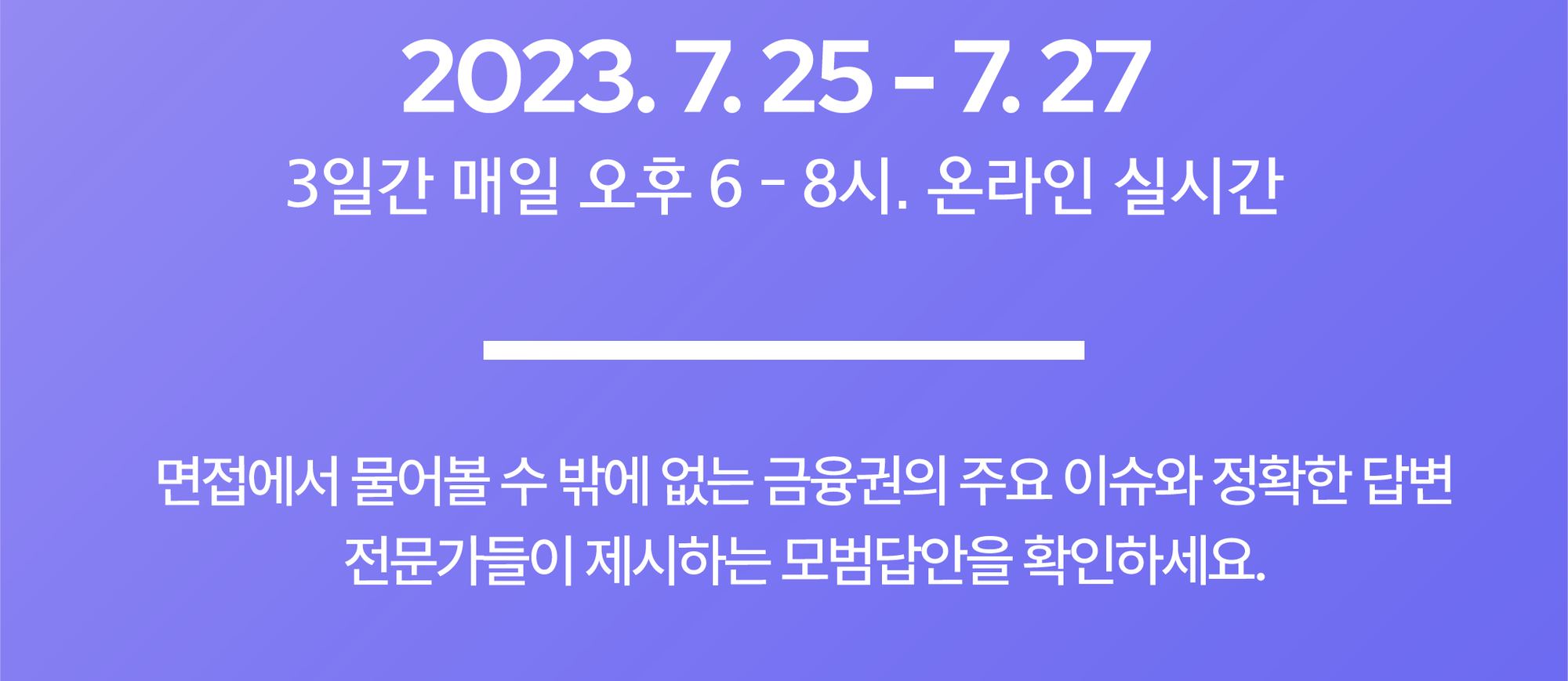 이번 특강은 3일간에 걸쳐 진행되는 집중 프로그램입니다. 면접에서 물어볼 수 있는 금융권의 주요 이슈와 정확한 답변 전문가들이 제시하는 모범답안을 확인하세요.