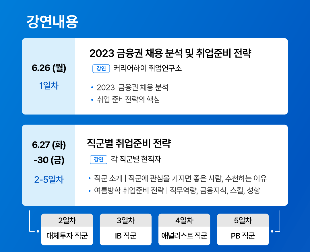 6월 26일(월) - 1일차: 2023 금융권 채용 분석 및 취업준비 전략 커리어하이 취업연구소가 2023년 금융권 채용 트렌드를 분석하고, 취업 준비의 핵심 방향을 제시합니다.