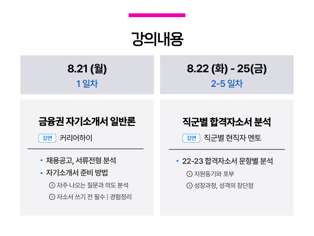 8월 22일(화)~25일(금) - 2~5일차: 직군별 합격자소서 분석 직군별 현직자 멘토들이 22-23 합격자소서 문항별 분석을 진행합니다. 지원동기와 포부, 성장과정, 성격의 장단점 등 핵심 문항들을 실제 합격 사례로 학습할 수 있습니다.