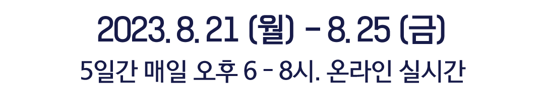 일정: 8월 21일(월) - 25일(금) 시간: 매일 오후 6시-8시 (2시간씩, 총 10시간) 방식: 온라인 실시간 강의