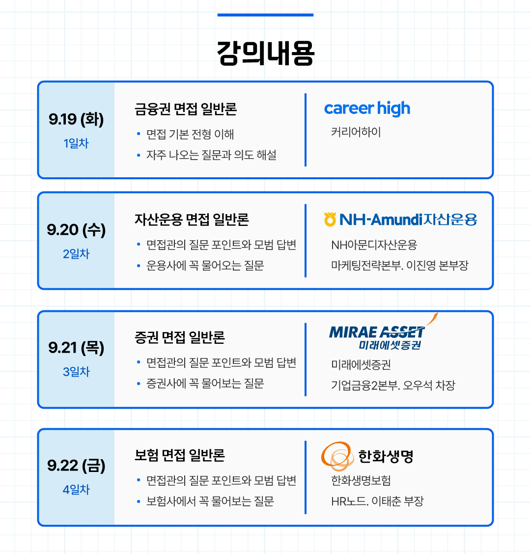 9월 22일(금) - 4일차: 보험 면접 일반론 한화생명보험 HR&도 이태훈 부장이 면접관의 질문 포인트와 모범 답변, 보험사에서 꼭 물어보는 질문들을 면접관의 시각에서 상세히 분석합니다.
