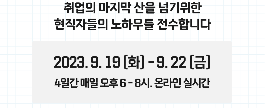 이번 특강은 4일간에 걸쳐 진행되는 실전 면접 완전 정복 프로그램입니다. 취업의 마지막 산을 넘기 위한 현직자들의 노하우를 전수합니다.