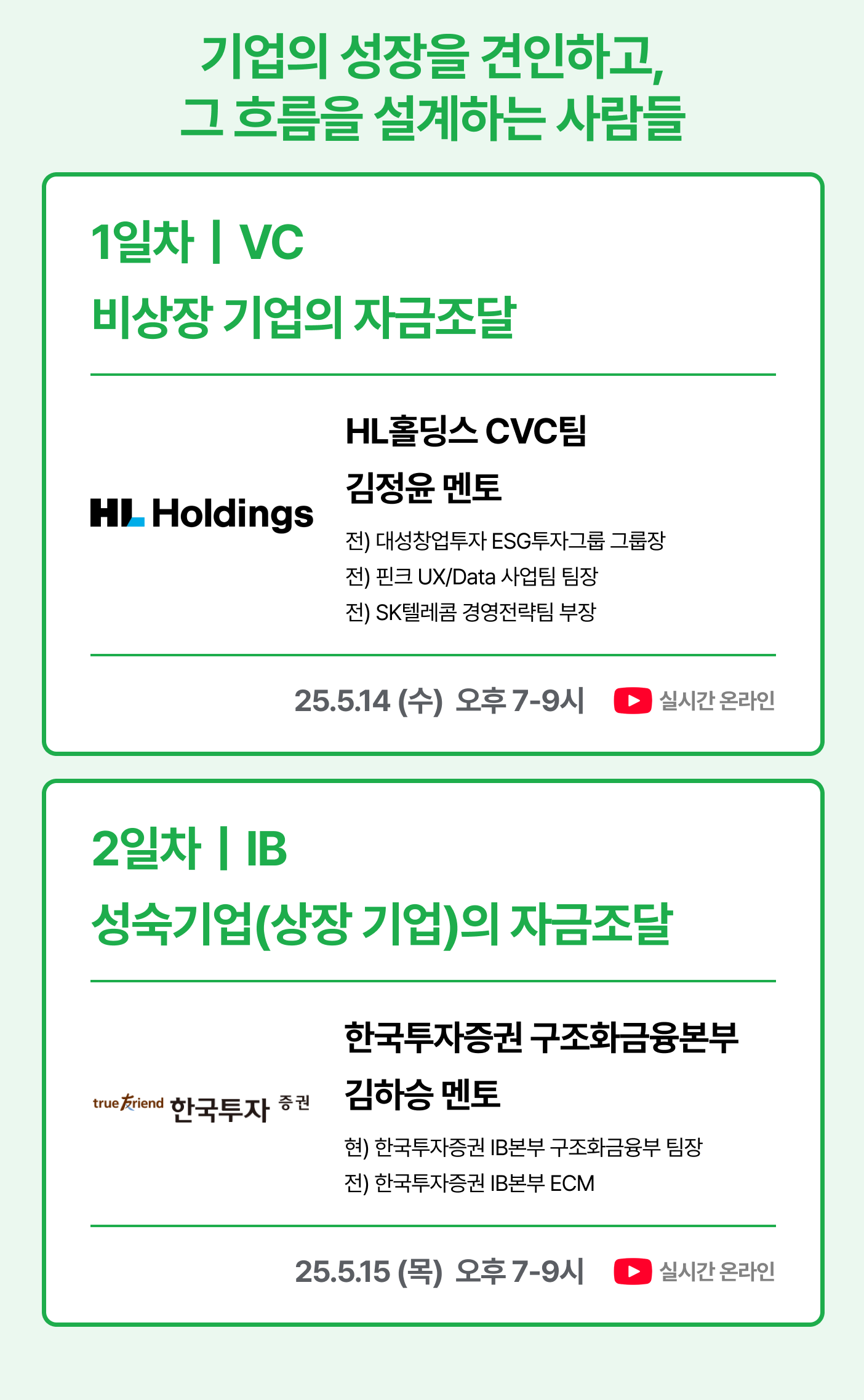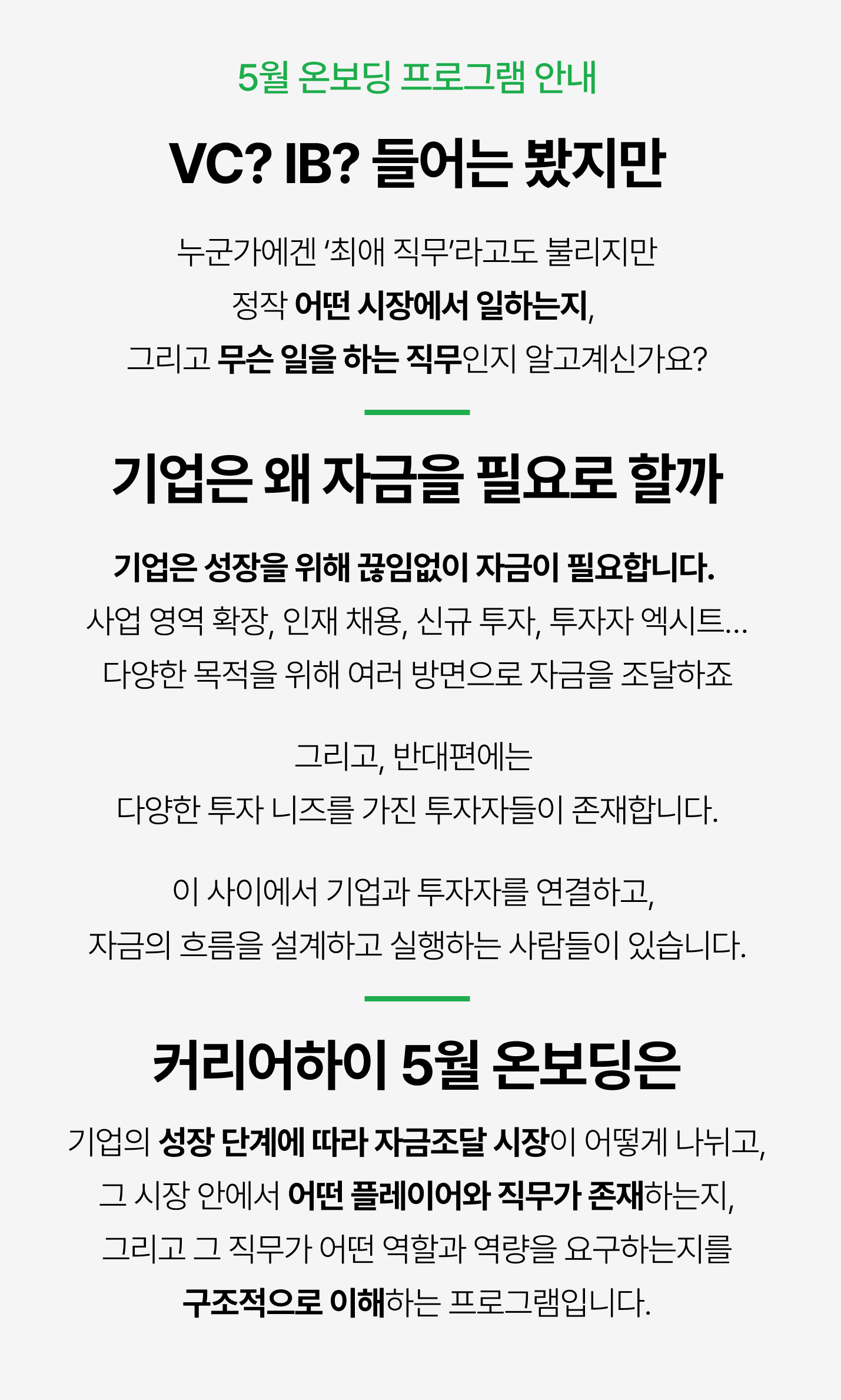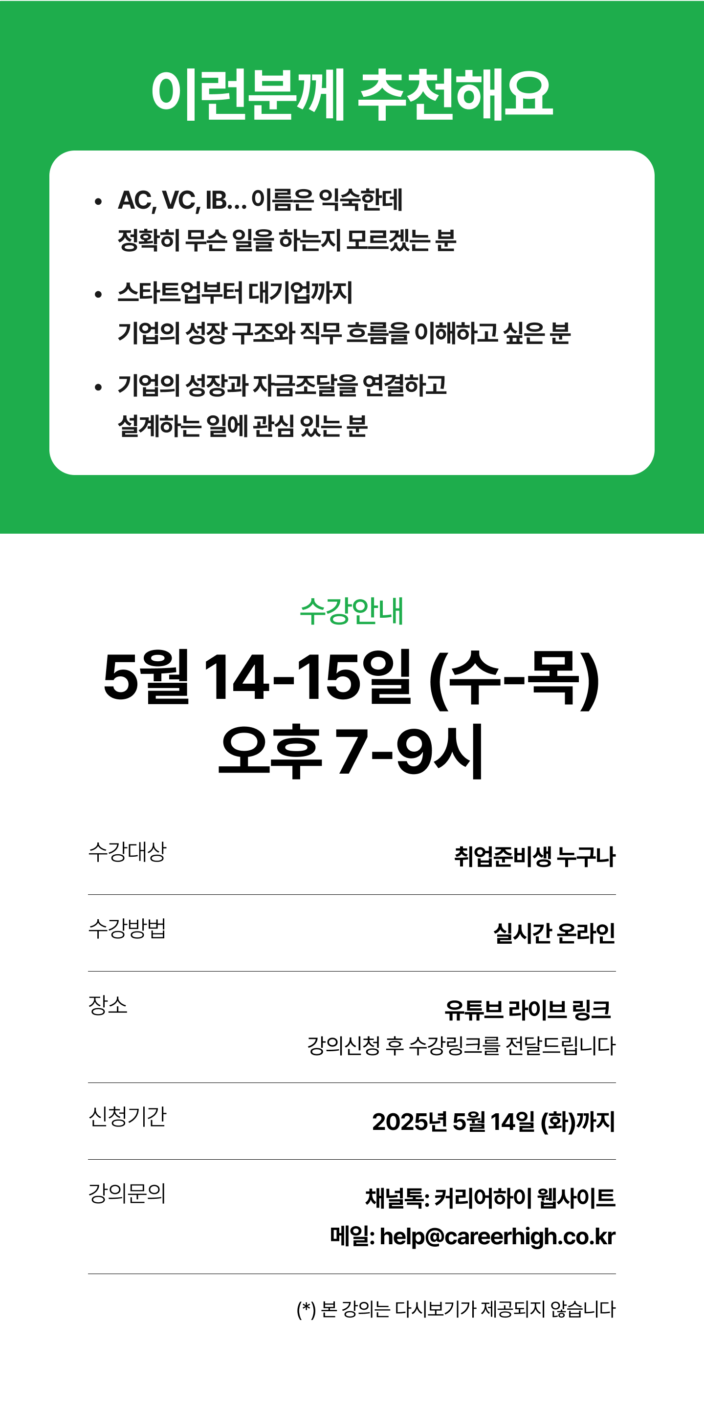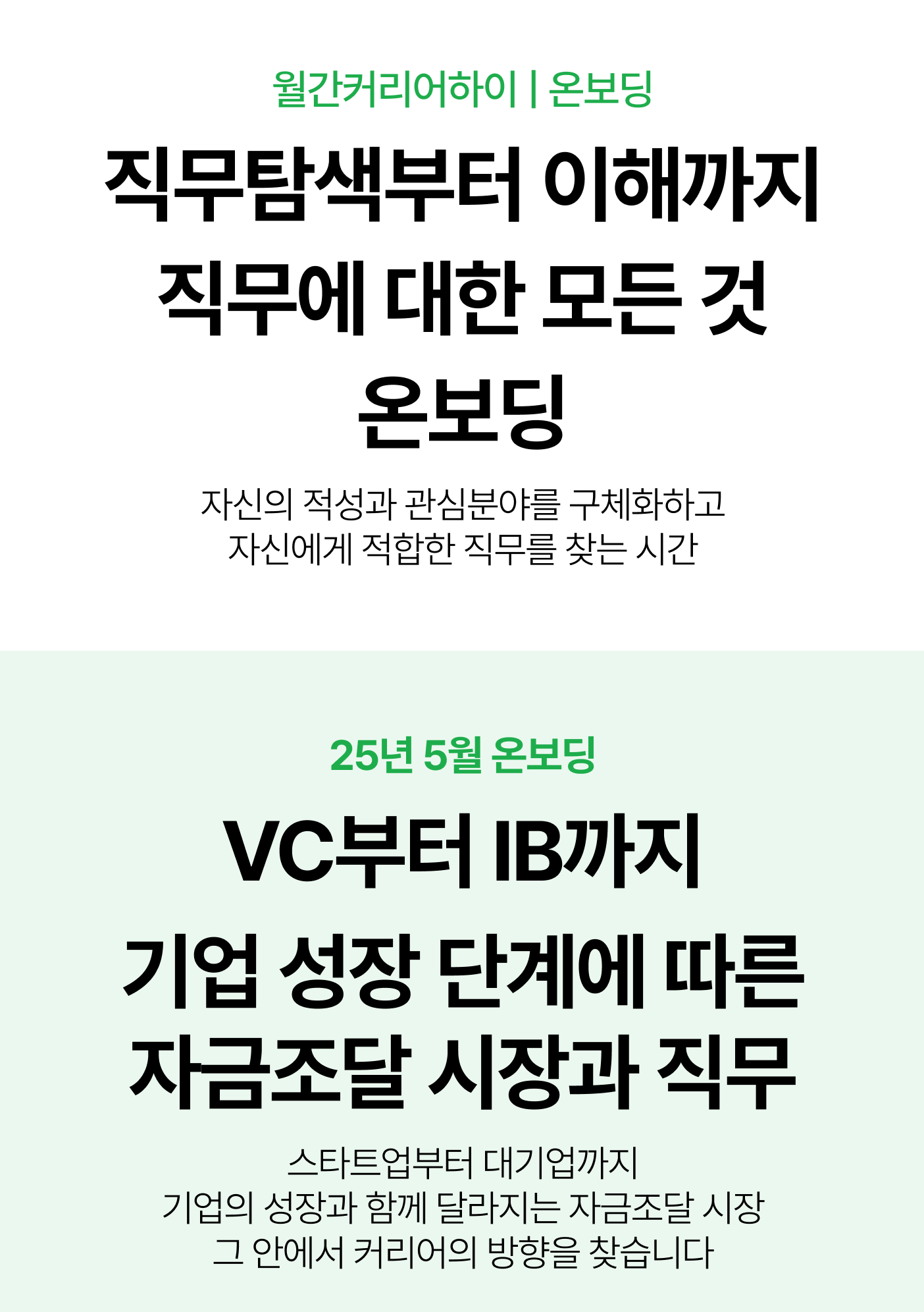 "VC와 IB, 왜 이렇게 주목받는 거죠?" "기업 성장 단계별로 어떤 직무가 있는 건가요?" "자금조달 시장이 어떻게 돌아가는지 감이 안 와요."