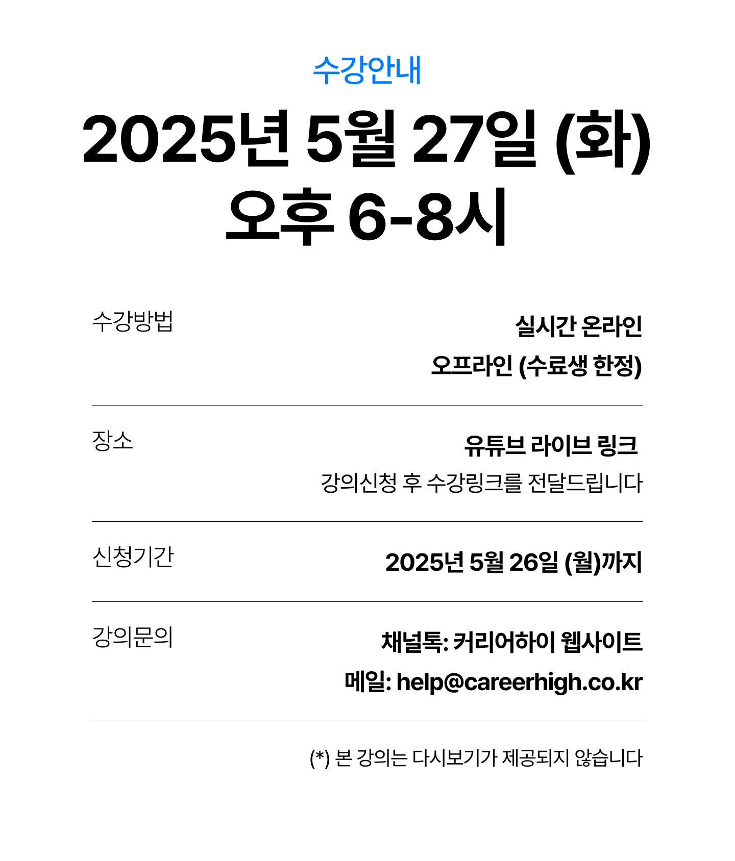 강의문의: 채널톡 - 커리어하이 웹사이트 / 메일 - help@careerhigh.co.kr