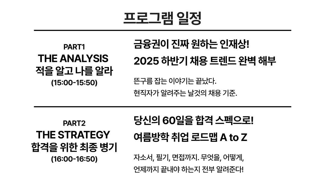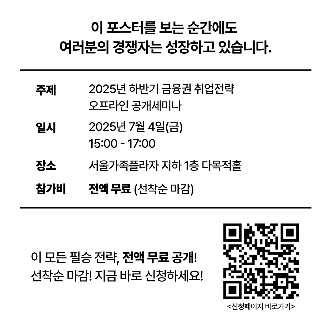 이번 세미나는 2025년 하반기 금융권 취업전략 오프라인 공개세미나로, 하반기 채용을 준비하는 모든 분들을 위한 커리어하이의 특별한 선물입니다.