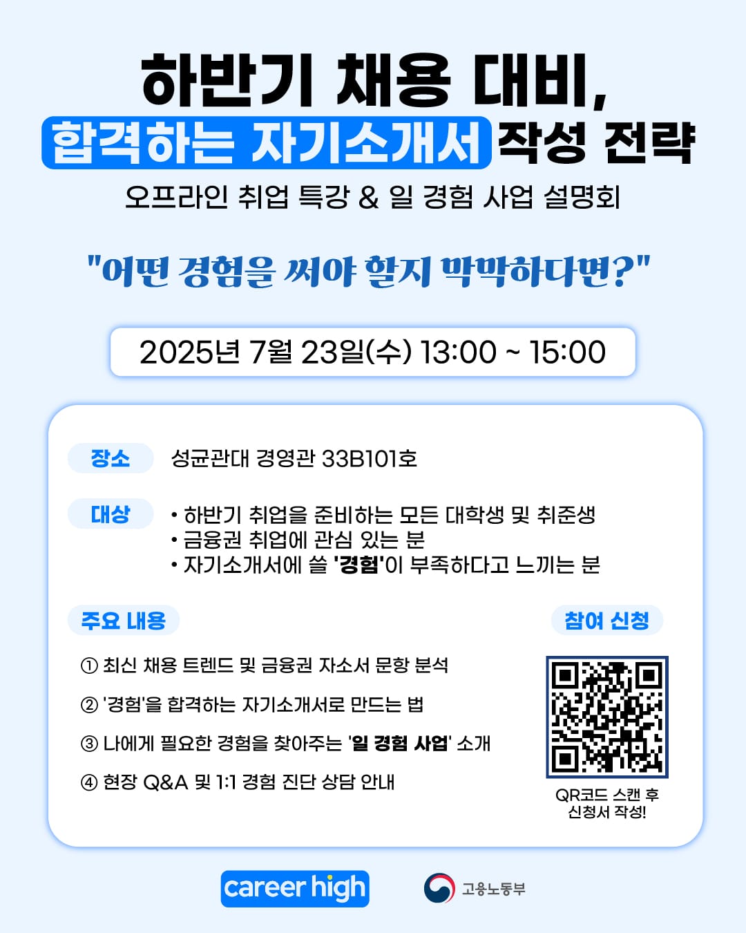 ON-Boarding을 통해 직무에 대한 이해를 높였다면, 이제 실전 지원을 위한 구체적인 전략이 필요합니다. 커리어하이는 특별히 7월에 두 차례의 오프라인 특강을 준비했습니다.