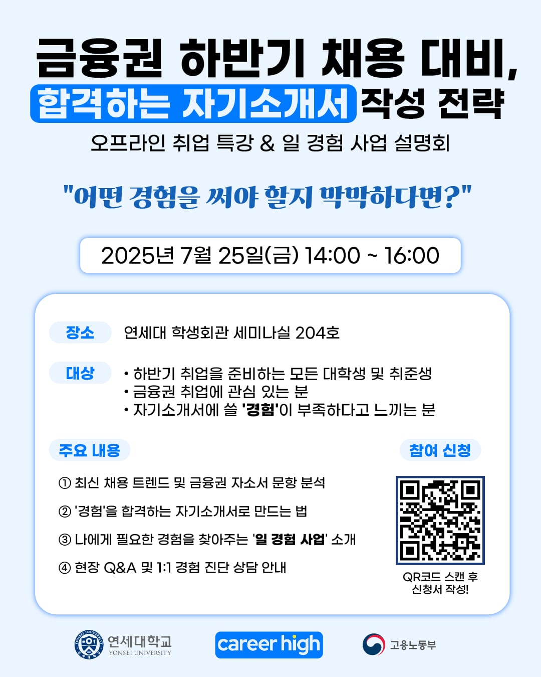 온라인으로는 전할 수 없는 생생한 현장감과 1:1 맞춤 상담까지. 하반기 채용을 앞둔 이 중요한 시점에서 직접 만나 구체적인 가이드를 받을 수 있는 특별한 기회입니다.