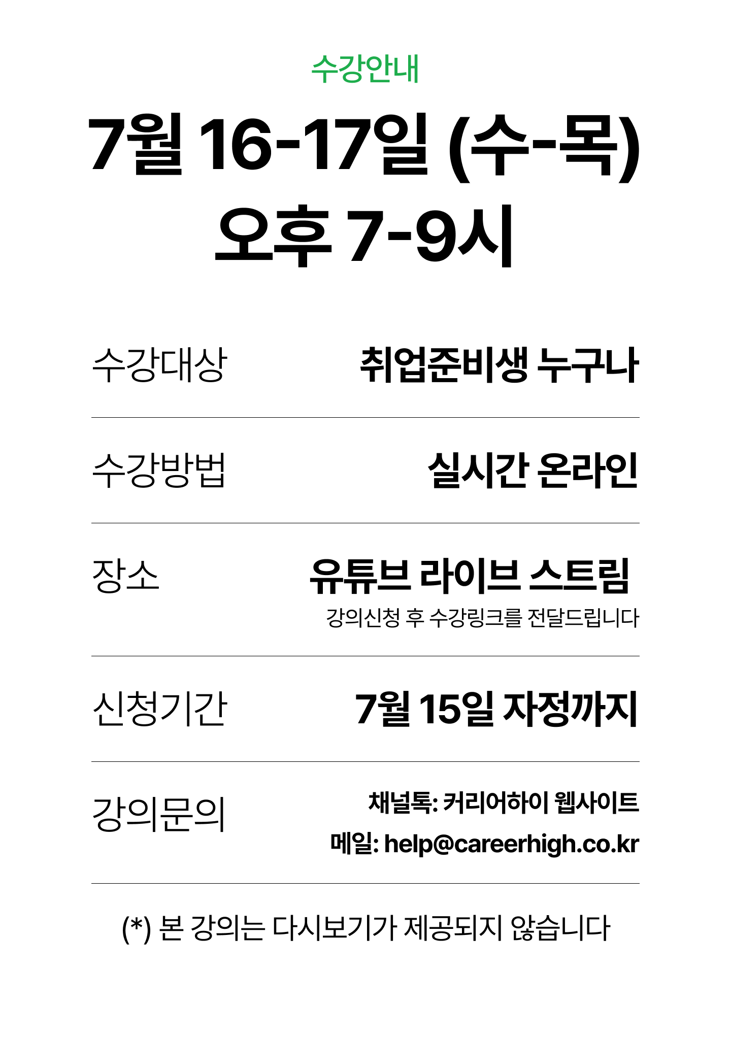 강의문의: 채널톡 - 커리어하이 웹사이트 / 메일 - help@careerhigh.co.kr