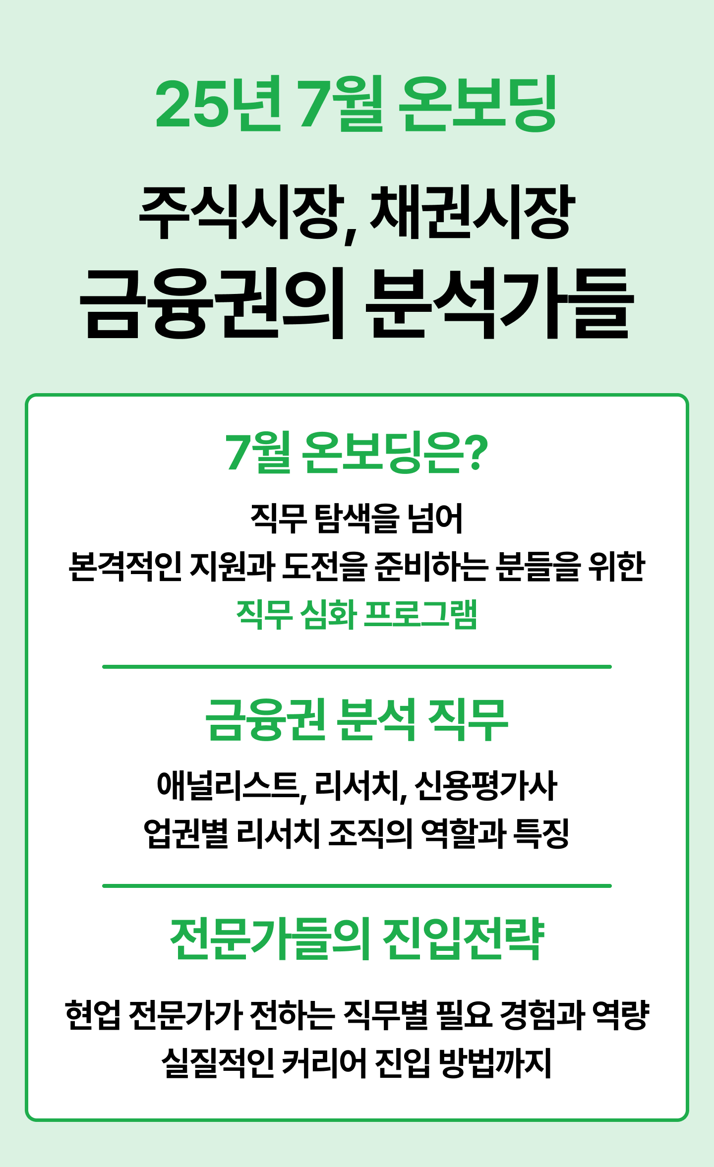 직무 탐색을 넘어 본격적인 지원과 도전을 준비하는 분들을 위한 직무 심화 프로그램입니다. 애널리스트, 리서치, 신용평가사 업권별 리서치 조직의 역할과 특징을 현직 전문가들이 직접 전해드립니다.
