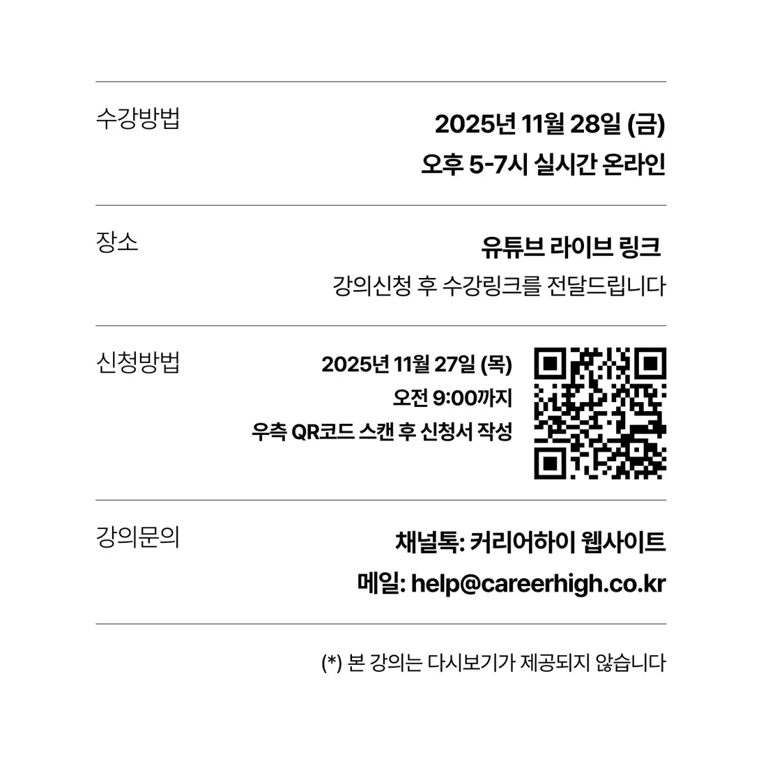 - 장소: 유튜브 라이브 링크 (강의신청 후 수강링크를 전달드립니다)