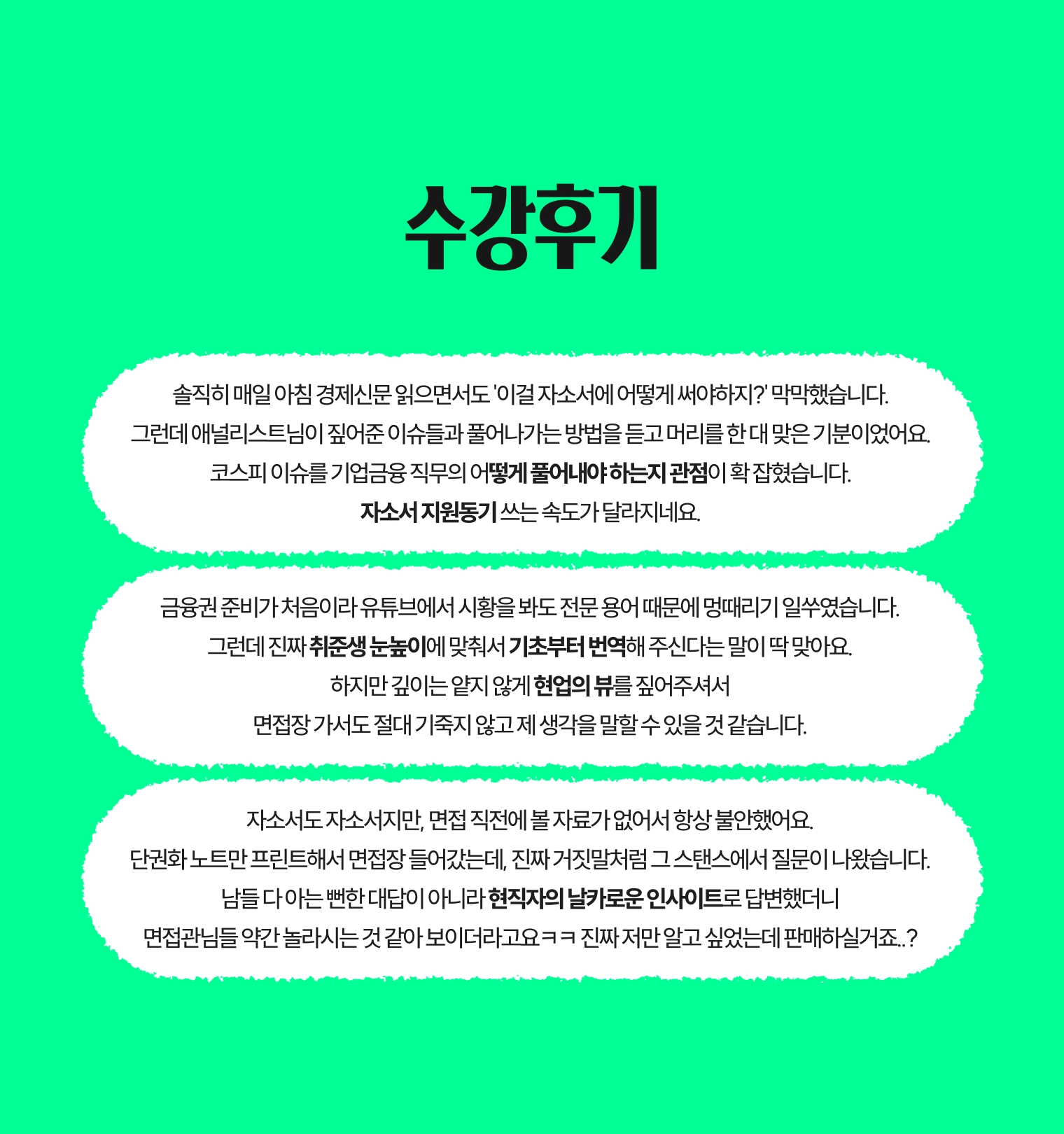 여의도의 언어를 취준생의 언어로 바꿉니다. 기초부터 설명하되, 깊이는 잃지 않습니다. 강의를 들은 뒤, 면접장에서 현직자의 인사이트로 당당하게 답변할 수 있게 됩니다.
